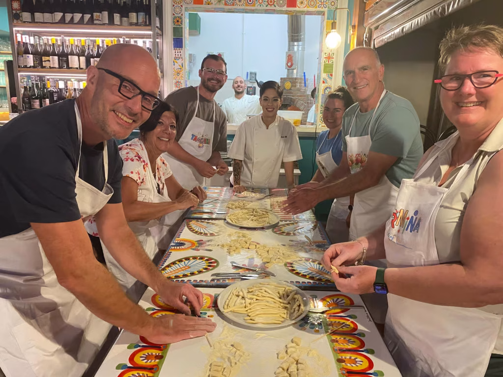 Learn to make fresh pasta, crispy arancini and classic cannoli, enjoy Sicilian appetizers and unlimited local wine, and end the evening sharing your dishes around the table in true Sicilian hospitality.